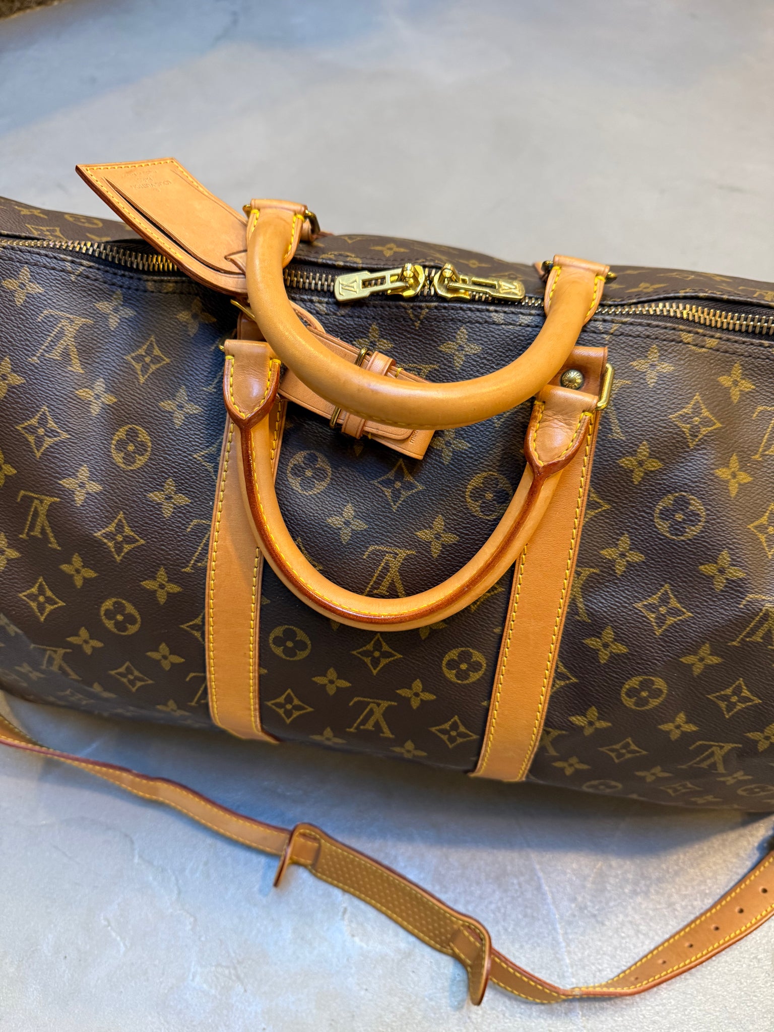 Discover this exceptional Louis Vuitton Keepall 55L, a timeless travel essential in like-new condition. This iconic monogram canvas duffel combines classic elegance with practical functionality, featuring the signature LV design and included shoulder strap for versatile carrying options. Perfect for weekend getaways or as a collector's piece, this vintage luxury bag maintains its pristine appearance and quality craftsmanship. The spacious 55L capacity accommodates all your travel needs while the durable construction ensures lasting appeal. A statement piece that transcends trends and seasons.