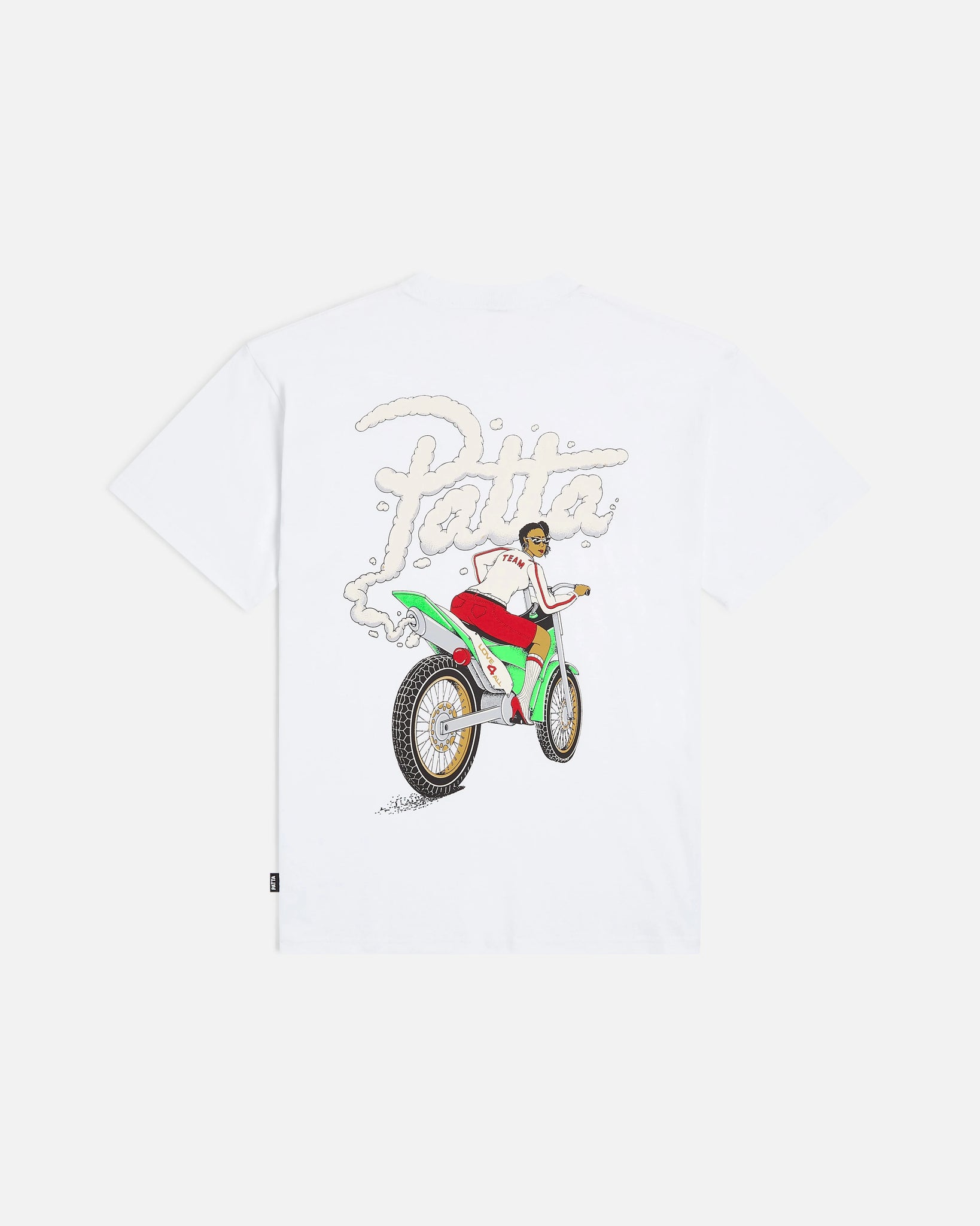 The Patta Biker T-Shirt in white combines streetwear style with a nod to biker culture, crafted from high-quality cotton for durability and comfort. Its clean design and tailored fit make it a versatile piece suitable for layering or wearing solo, offering both style and practicality for everyday wear.